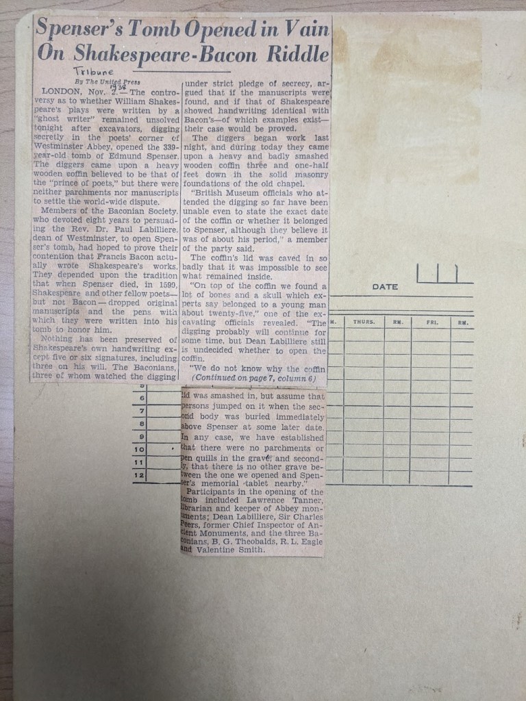 The Baconian Society tried to prove that the father of the scientific method, Francis Bacon, wrote Shakespeare’s plays by digging up Edmund Spenser’s tomb—and clearly it was in vain. I wonder why Dorothy took this clipping, and what about the conspiracy theory caught her focus. These old men were looking beneath the earth for answers; she was looking up, past our planet. They had a shovel; she had a telescope. Perhaps she imagined she was like the secret society, sitting alone in the observatory or library, where it was just her and the stars. Or it might have been the way the Baconians searched for truth: based on the stories of their fathers, fixated on an idea of the past. Dorothy was studying a science passed onto her from a male-dominated academia; but it was still the very matter of the Universe, which existed since the beginning of time. I think it was the mysticism of discovery that struck her.